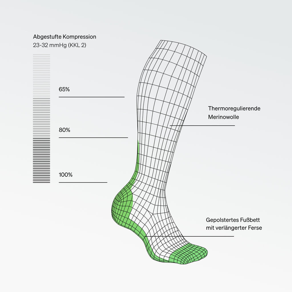 Unsere Kompression übt gezielten Druck auf Beine und Füße aus, um die Blutzirkulation zu verbessern. Die innovative, abgestufte Kompression ist am Knöchel am stärksten und nimmt nach oben hin ab, wodurch der Blutfluss optimiert und Blutstau verhindert wird.