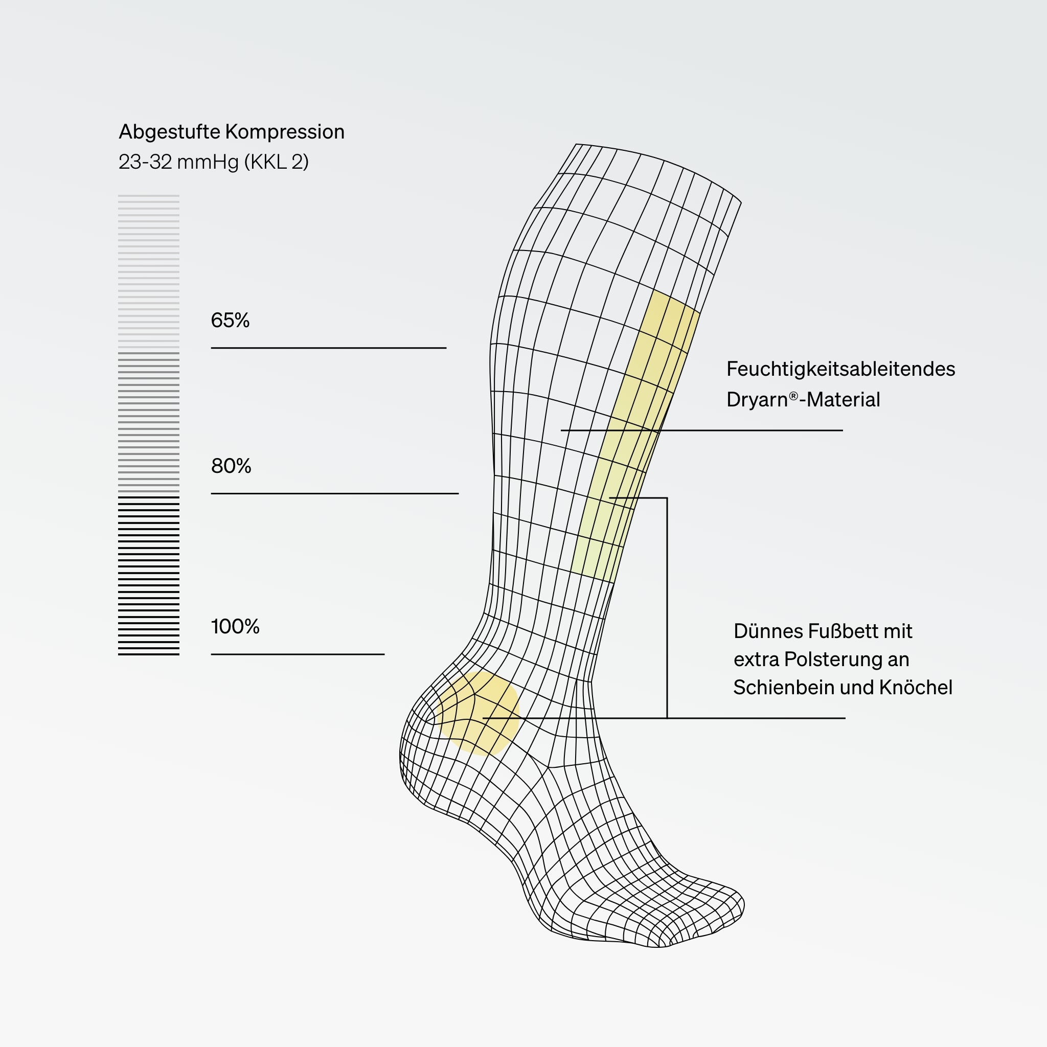 Unsere Kompression übt gezielten Druck auf Beine und Füße aus, um die Blutzirkulation zu verbessern. Die innovative, abgestufte Kompression ist am Knöchel am stärksten und nimmt nach oben hin ab, wodurch der Blutfluss optimiert und Blutstau verhindert wird.