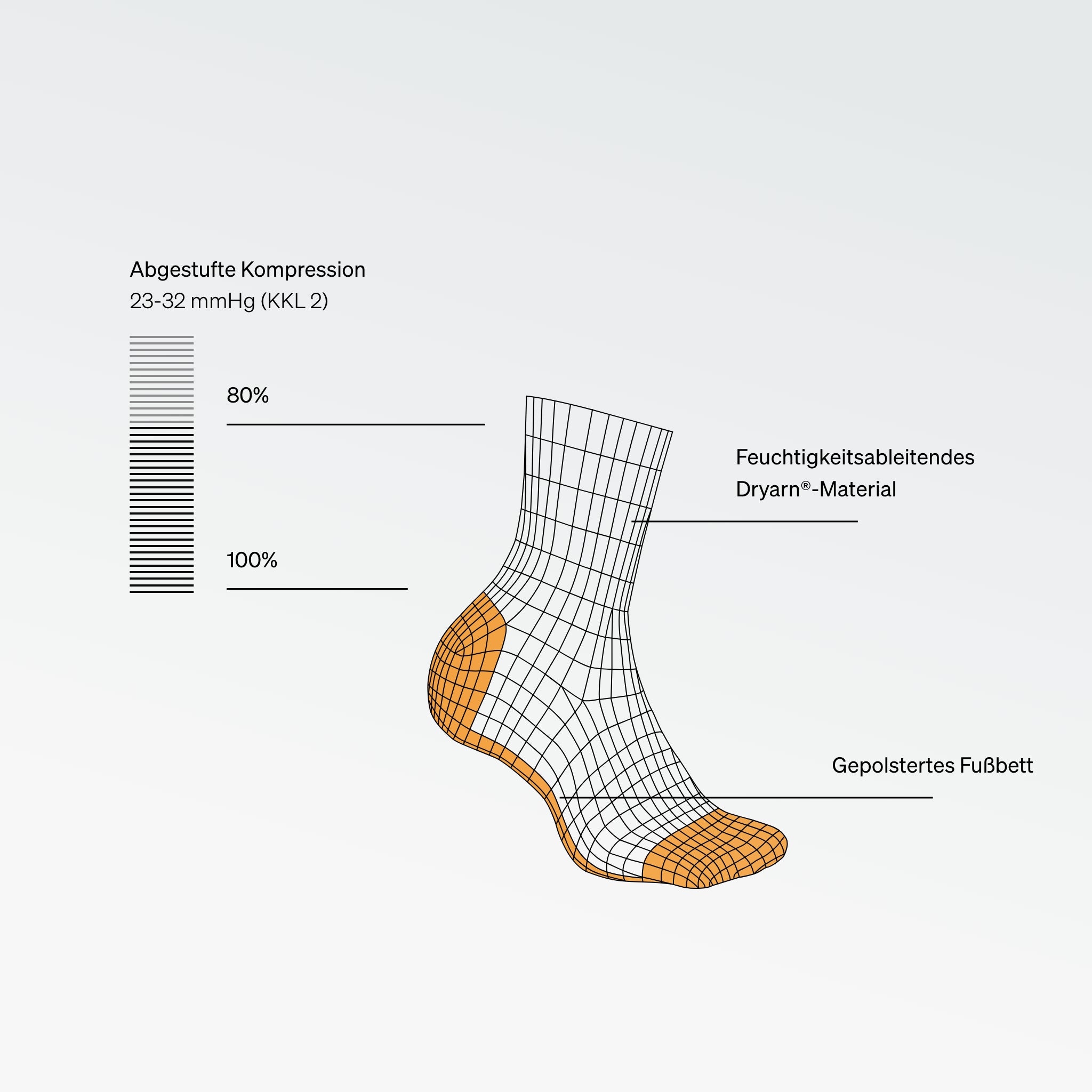 Die gezielte Kompression übt präzisen Druck auf zentrale Punkte an Knöcheln und Füßen aus, und fördert dadurch die Durchblutung und sorgt für optimale Stabilität. Der Druck ist an den Knöcheln am stärksten und nimmt Richtung Wade allmählich ab, wodurch der Blutfluss optimiert und Blutstau verhindert wird