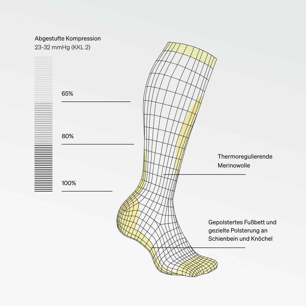 Unsere Kompressions-Skisocken für Herren mit thermoregulierender Merinowolle fördern die Durchblutung, reduzieren Ermüdung & halten die Füße warm. Gezielte Polsterung sorgt für ganztägigen Komfort.