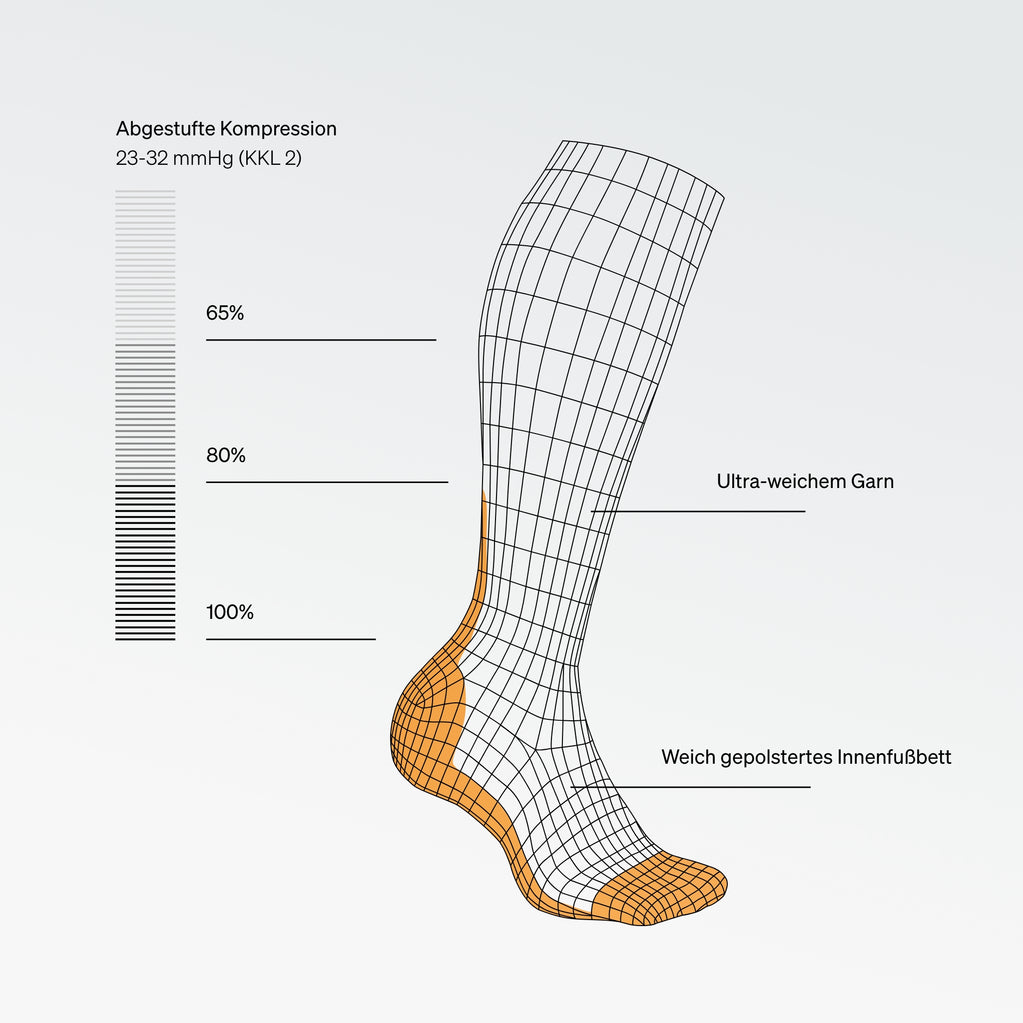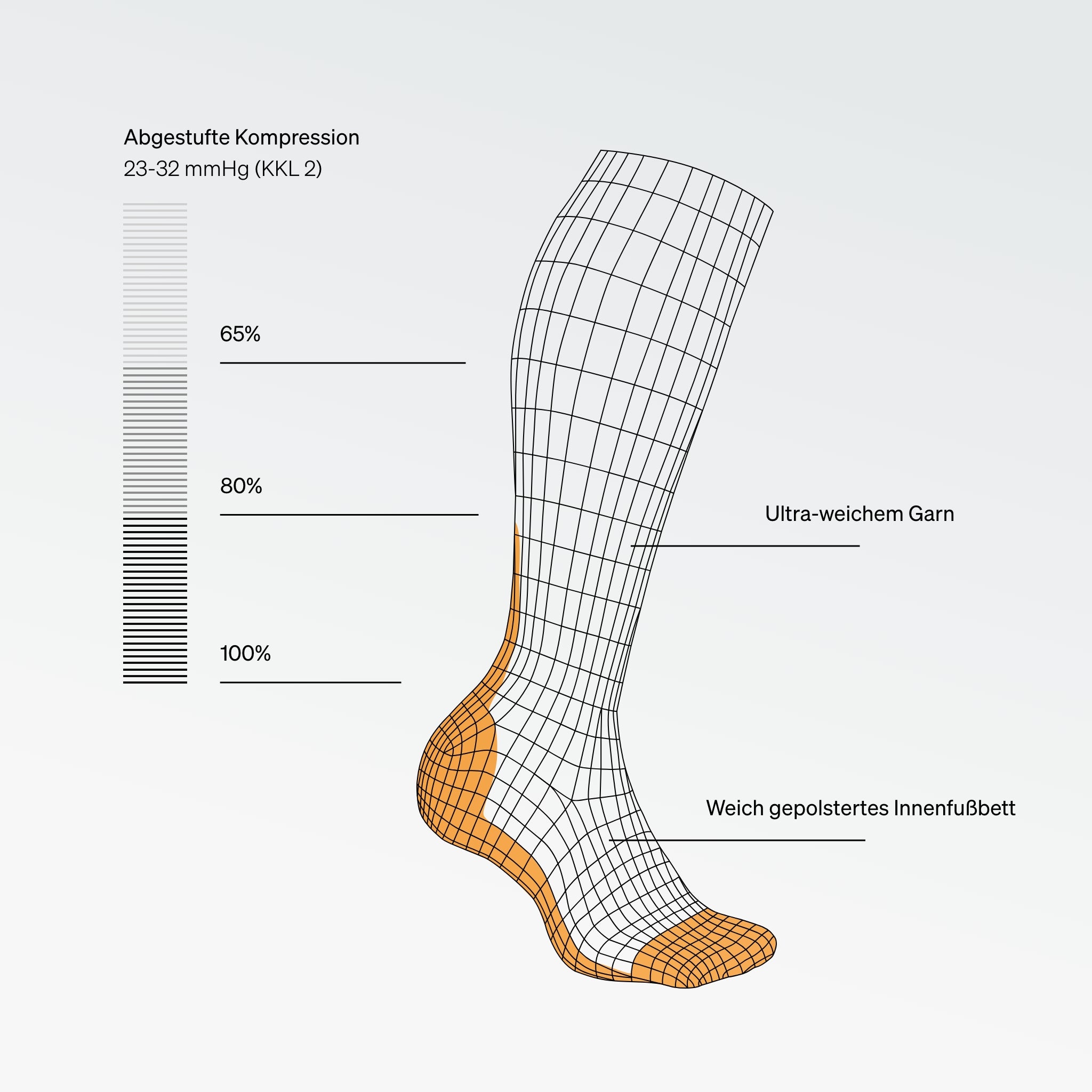 Unsere Kompression übt gezielten Druck auf Beine und Füße aus, um die Blutzirkulation zu verbessern. Die innovative, abgestufte Kompression ist am Knöchel am stärksten und nimmt nach oben hin ab, wodurch der Blutfluss optimiert und Blutstau verhindert wird