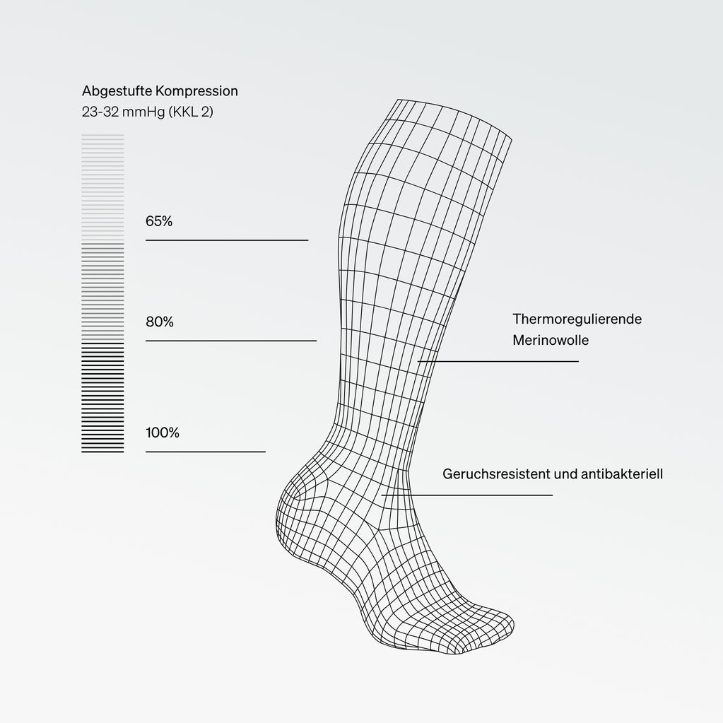 Unsere Kompression übt gezielten Druck auf Beine und Füße aus, um die Blutzirkulation zu verbessern. Die innovative, abgestufte Kompression ist am Knöchel am stärksten und nimmt nach oben hin ab, wodurch der Blutfluss optimiert und Blutstau verhindert wird.