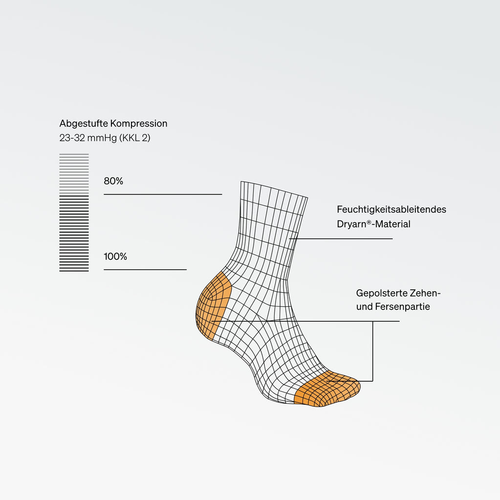 Die gezielte Kompression übt präzisen Druck auf zentrale Punkte an Knöcheln und Füßen aus, und fördert dadurch die Durchblutung und sorgt für optimale Stabilität. Der Druck ist an den Knöcheln am stärksten und nimmt Richtung Wade allmählich ab, wodurch der Blutfluss optimiert und Blutstau verhindert wird.