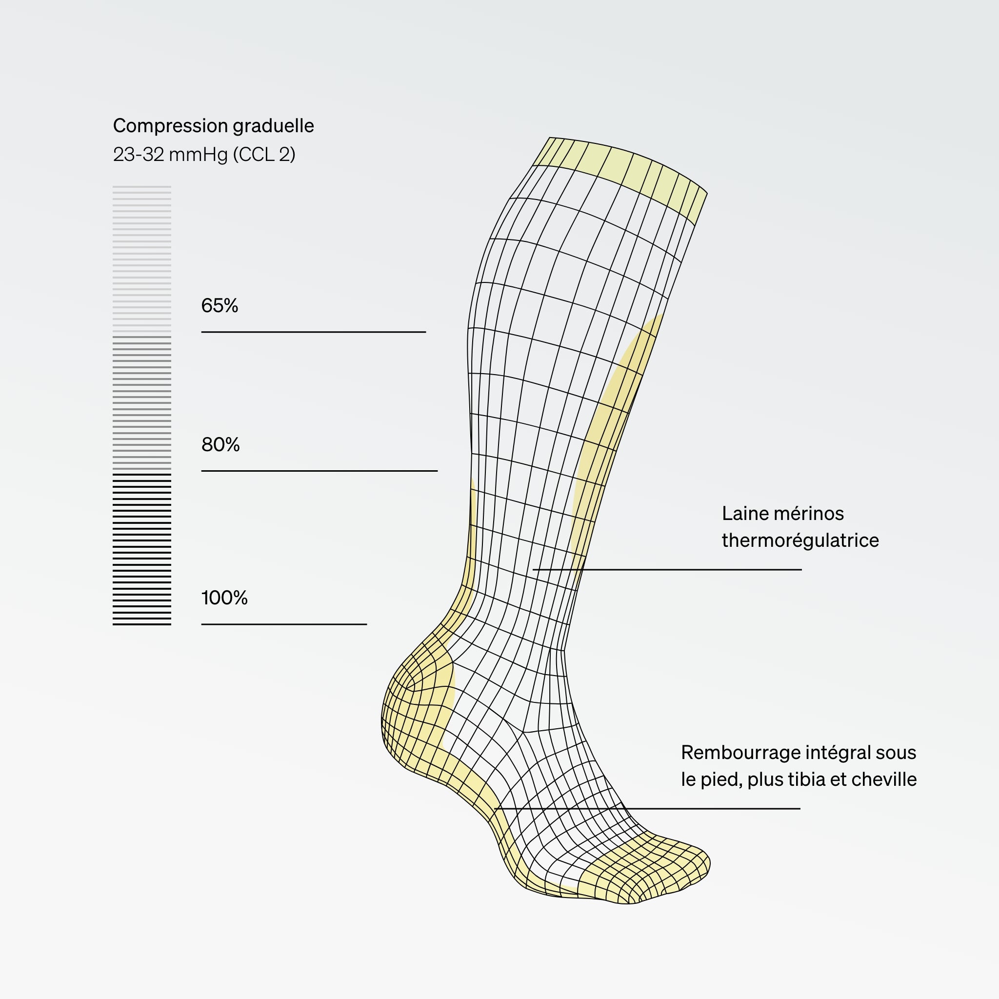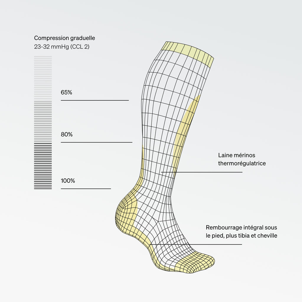 La compression graduelle avancée permet d'appliquer une pression précise aux points clés des jambes et des pieds pour optimiser la circulation. Plus serrée au niveau des chevilles, la compression se relâche progressivement le long des jambes, ce qui favorise la circulation sanguine.