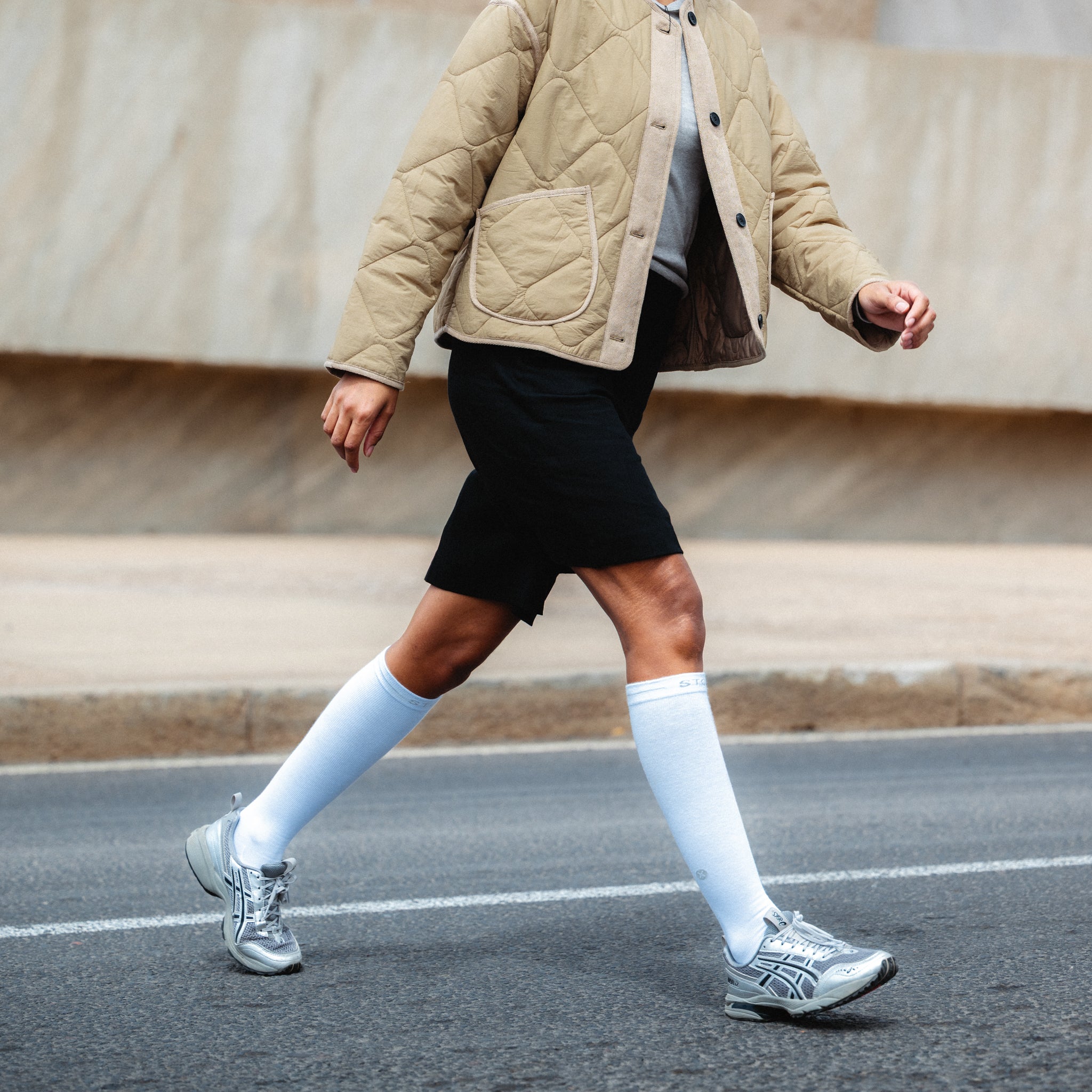 Dames compressiesokken voor dagelijks gebruik stimuleren de bloedsomloop om vermoeidheid, zwelling en spataderen te voorkomen. Gemaakt van ademend katoen om je de hele dag fris te houden.