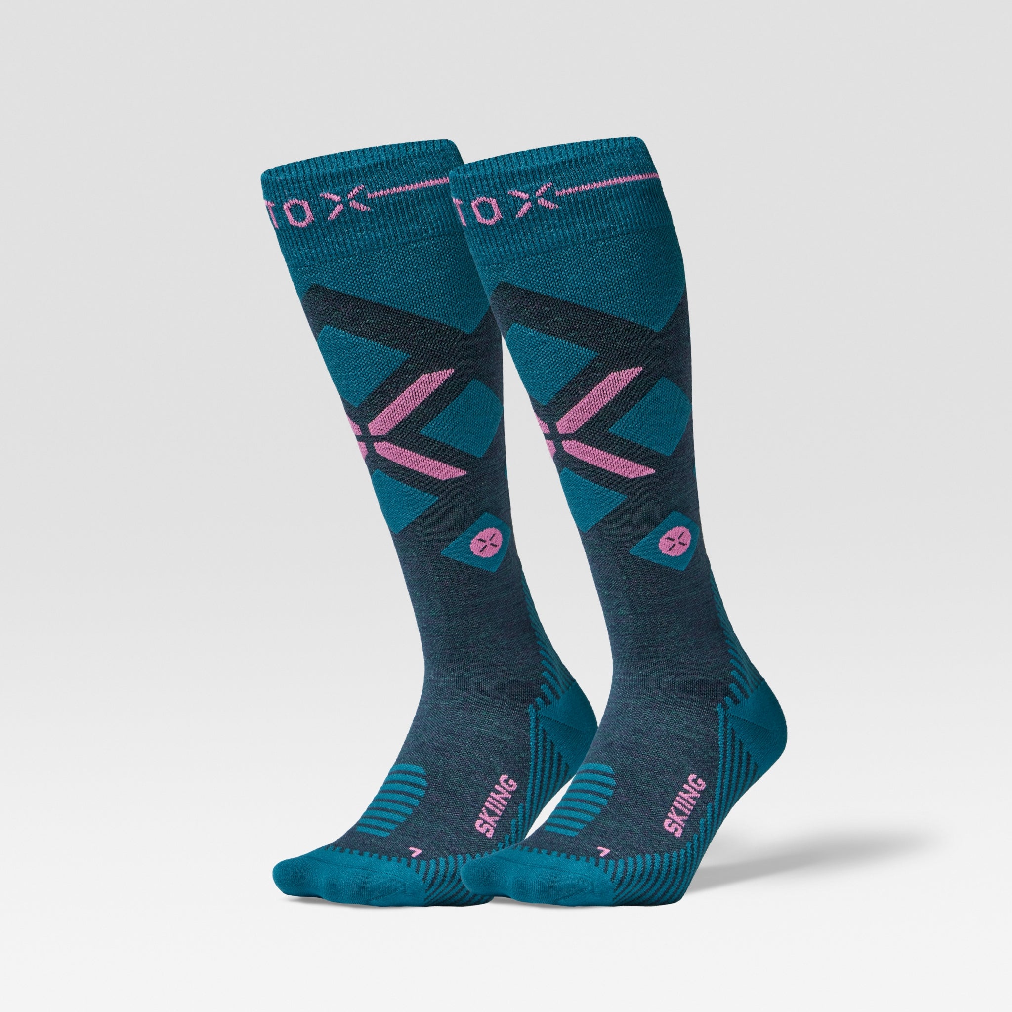 Onze ski compressiesokken voor dames met thermoregulerend Merino wol stimuleren de bloedsomloop, verminderen vermoeidheid en houden je voeten warm. Gerichte versteviging voor ultiem comfort.