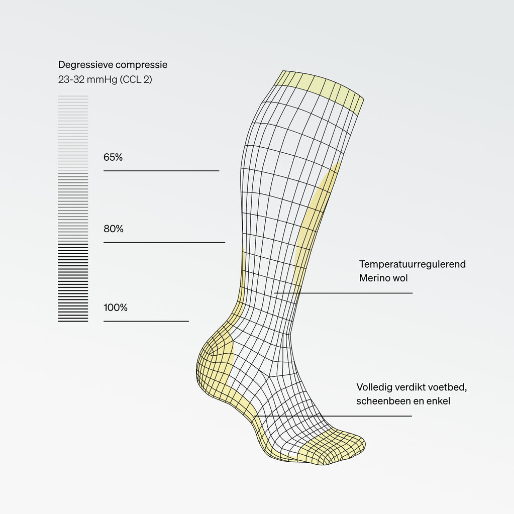 Onze ski compressiesokken voor dames met thermoregulerend Merino wol stimuleren de bloedsomloop, verminderen vermoeidheid en houden je voeten warm. Gerichte versteviging voor ultiem comfort.