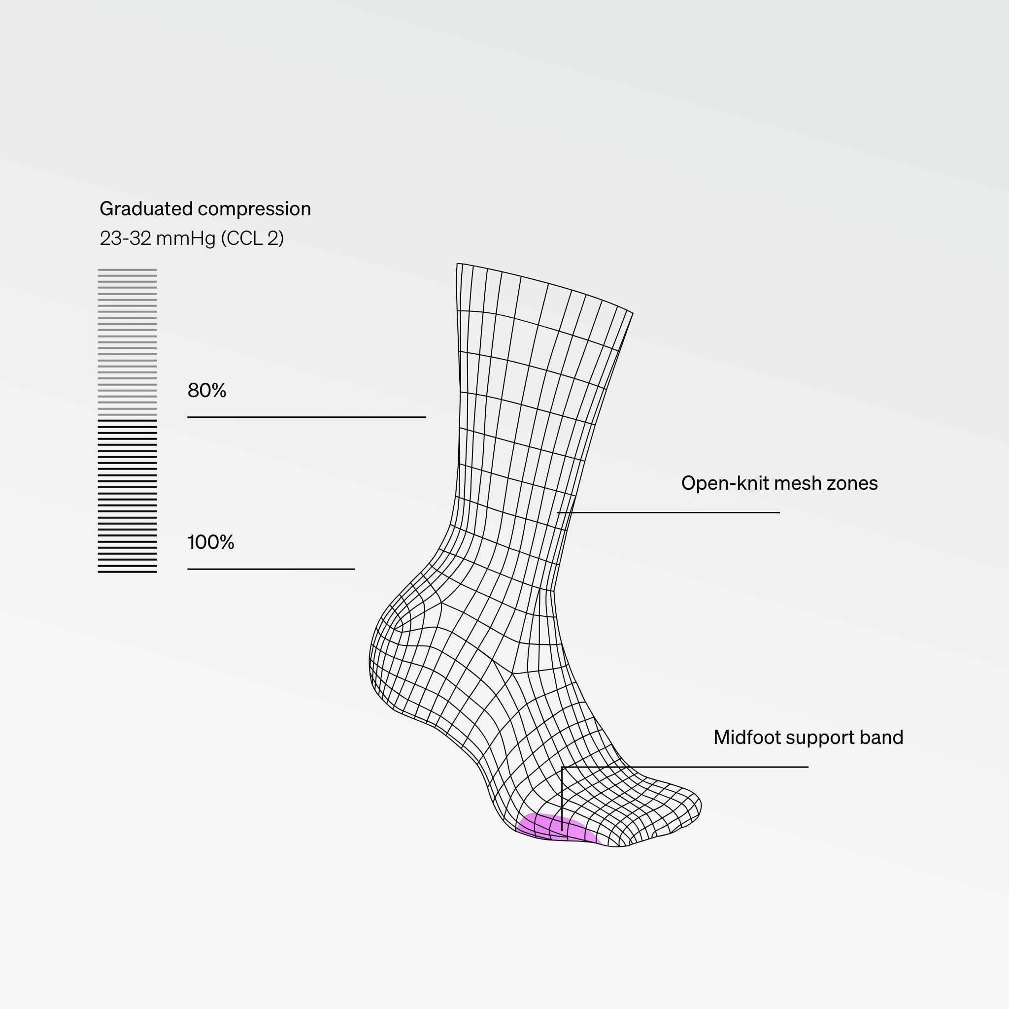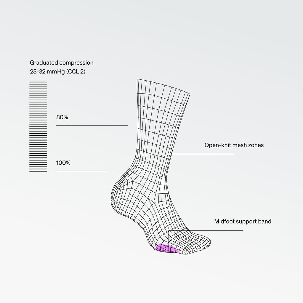 Advanced graduated compression applies precise pressure at key points on the legs and feet to optimize circulation. Tighter at the ankles, the compression gradually loosens up to the mid-calf, helping blood flow freely instead of pooling.