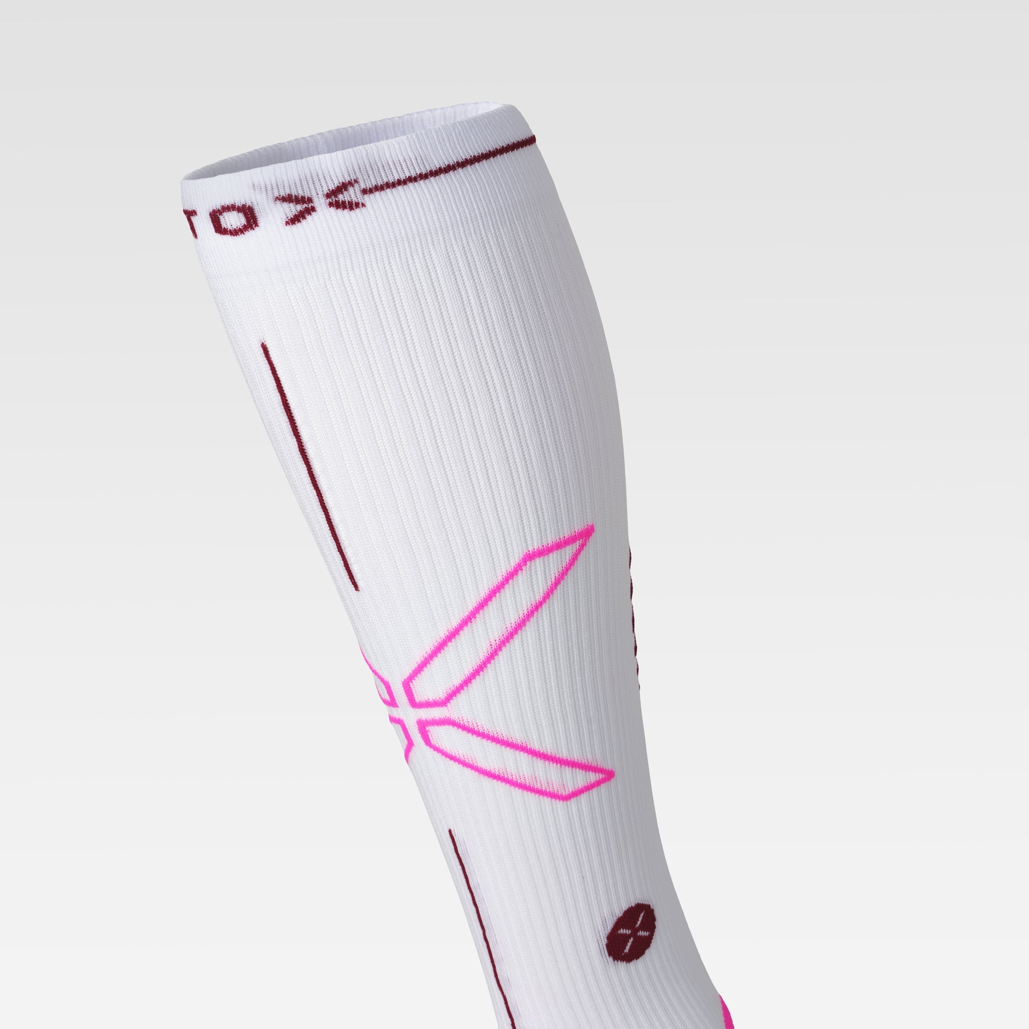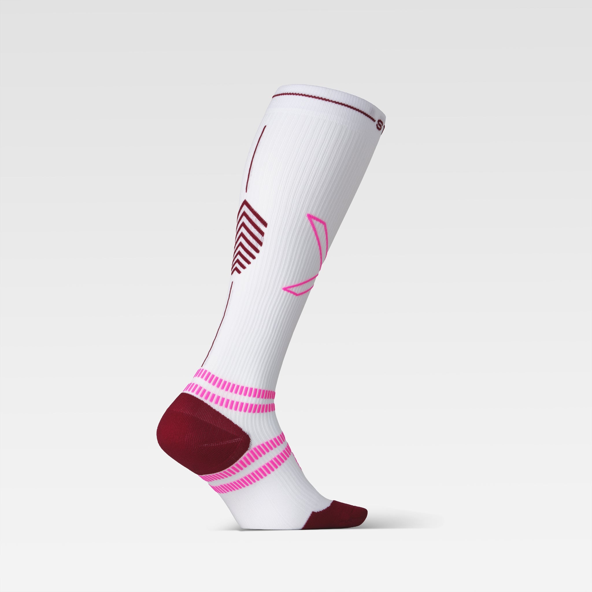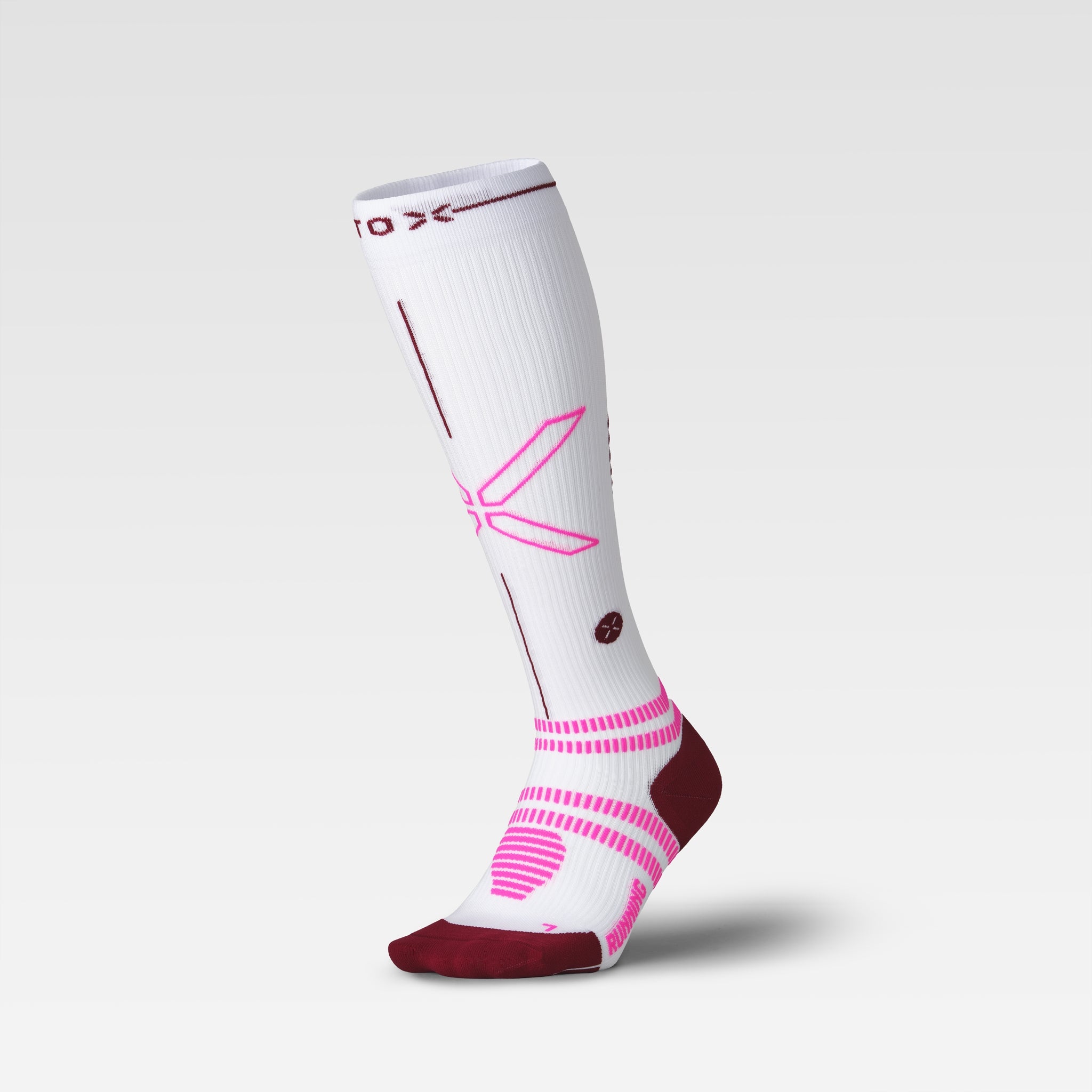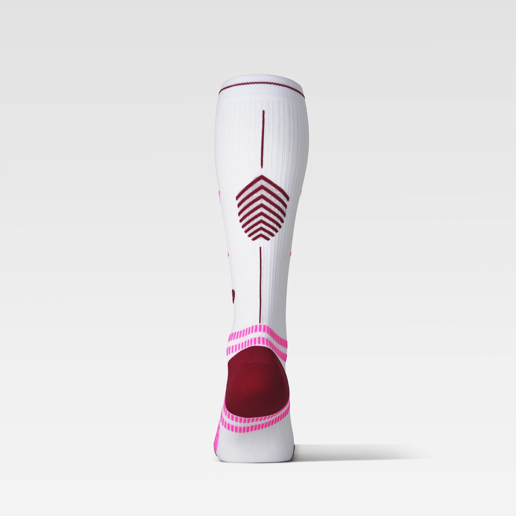 Our women's running compression socks enhance blood circulation, reducing shin splints & muscle fatigue. The padded toe and heel provide comfort & impact protection.